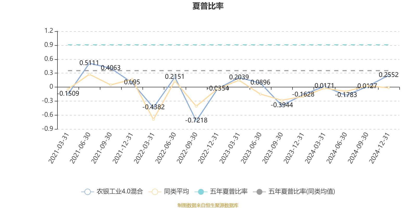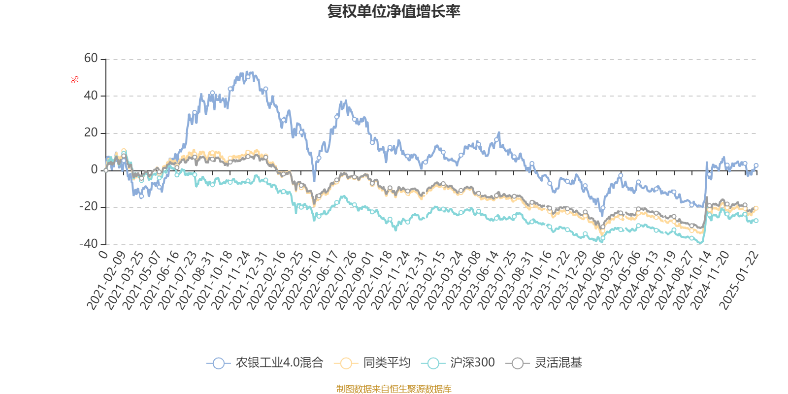 截至1月22日,农银工业4.0混合近三个月复权单位净值增长率为-0.65%,位于同类可比基金346/920;近半年复权单位净值增长率为16.27%,位于同类可比基金177/920;近一年复权单位净值增长率为26.35%,位于同类可比基金141/920;近三年复权单位净值增长率为-23.69%,位于同类可比基金467/898。