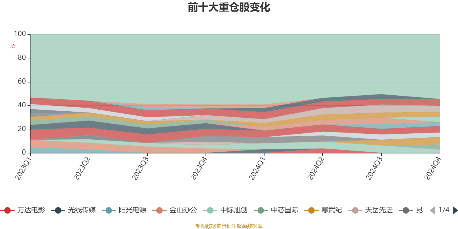 截至2024年四季度末,基金十大重仓股分别是寒武纪、恺英网络、宁德时代、立讯精密、芒果超媒、中芯国际、北方华创、比亚迪、沪电股份、中际旭创。